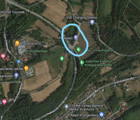 Durch Theley fahren in Richtung Tholey. An der Tankstelle rechts abbiegen und der L135 folgen den Ort hinaus Richtung Tholey. Nach ca. 500mtr. vor der Fußgängerampel nach links auf den Parkplatz abbiegen.